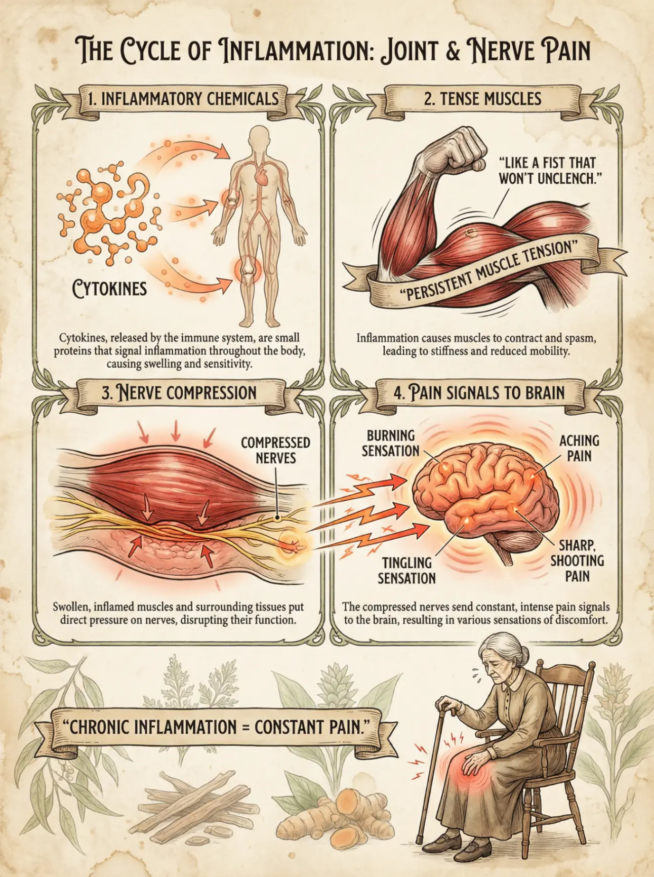 As we age, our bodies develop what scientists call "inflammaging"—a 24/7 level of inflammation that bathes our nerves, joints, and muscles in inflammatory chemicals.