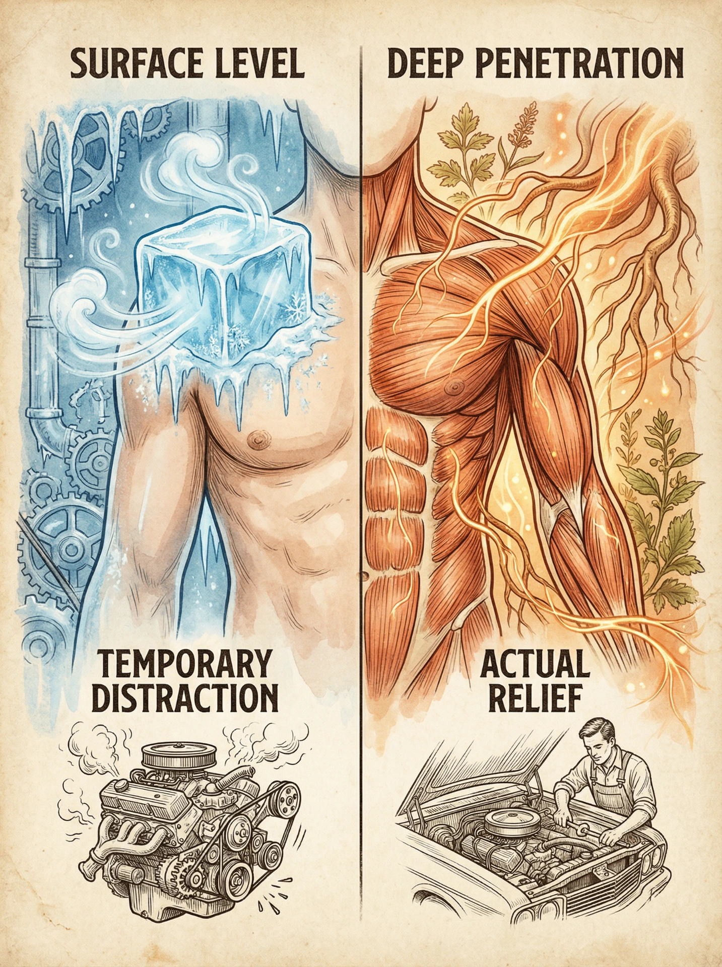 - Physically penetrate deep through the skin to reach inflamed nerves and muscle tissue (unlike surface cooling gels)